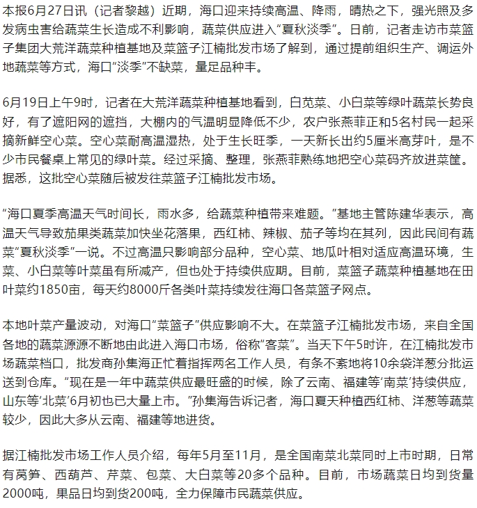首页 / 信息中心 / 媒体报道 / 【海口日报】“淡季”不缺菜量足品种丰