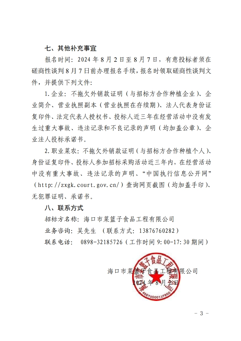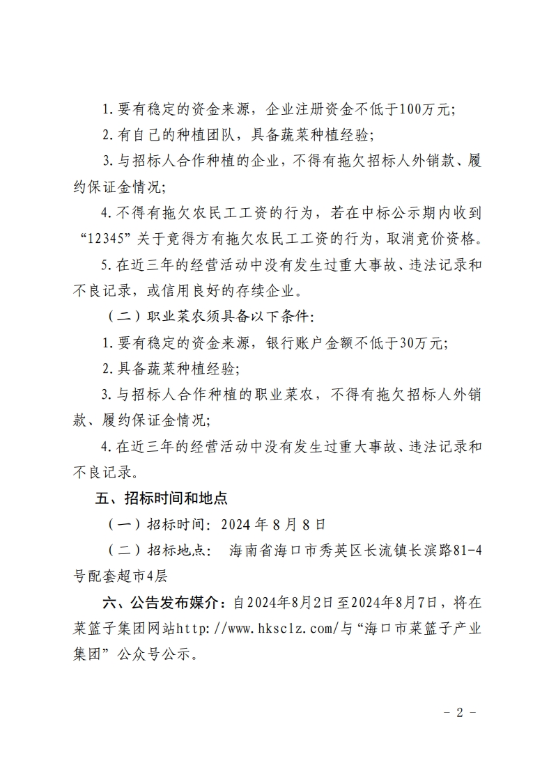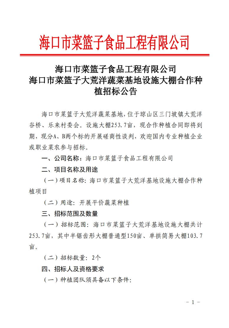 香港二四六论坛308 海口市菜篮子大荒洋蔬菜基地设施大棚合作种植招标公告