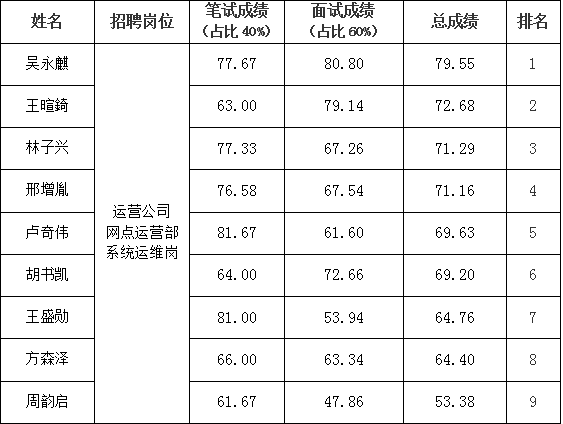根据《海口市乡村振兴投资发展集团有限公司2024年“海南学子 就在海南”留才行动暨国企专场招聘会和“汇聚海南 四城同办”校招活动招聘方案》有关规定,经统计考核得分情况,现将我司下属子公司运营公司网点运营部系统运维岗位笔试、面试成绩予以公示。