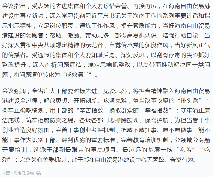首页 / 信息中心 / 党建工作 / 【海南日报】海南省深入贯彻中央八项规定精神学习教育“学先进、带后进、转作风、促发展”会议召开