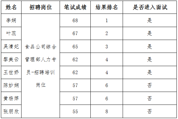 根据《海口市乡村振兴投资发展集团有限公司参加2025年海南省毕业生就业大型招聘活动招聘方案》有关规定,经统计笔试得分情况,现将菜篮子集团下属子公司食品公司综合管理部人力专员-招聘培训岗位笔试成绩及进面试人选公示如下: