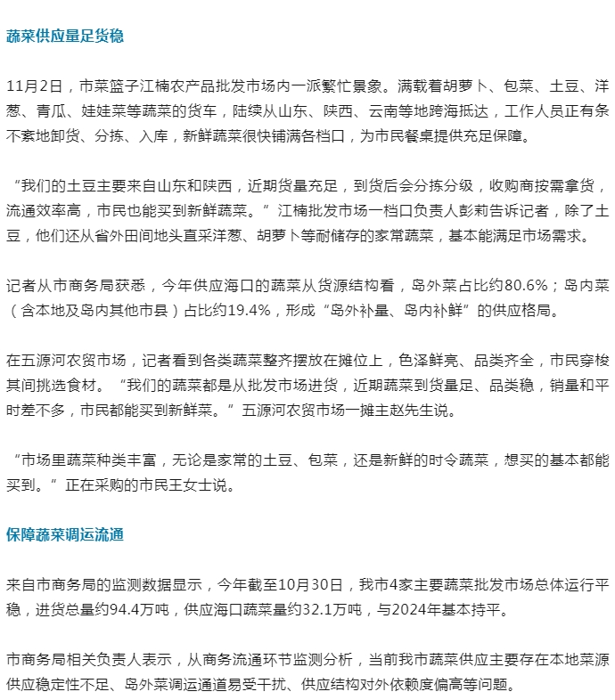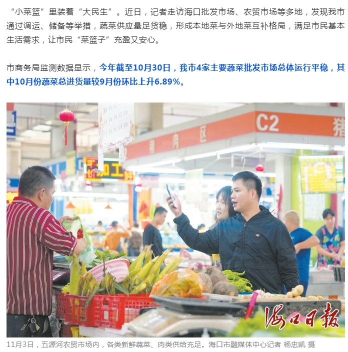 【海口日报】“菜篮子”管够!10月海口蔬菜总进货量环比上升6.89%