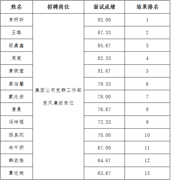 根据《海口市乡村振兴投资发展集团有限公司参加2025年“封关拓新局·四城同办”校招活动招聘方案》有关规定,经统计面试得分情况,现将菜篮子集团党群工作部党风廉政岗位面试成绩公示如下: