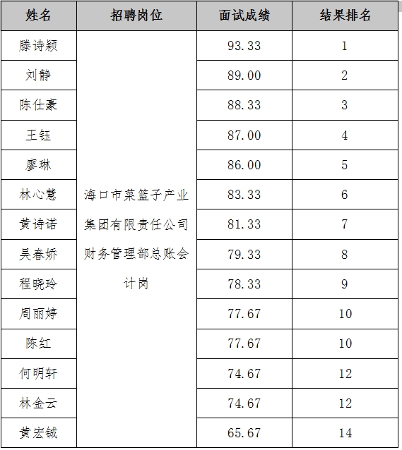根据《海口市乡村振兴投资发展集团有限公司参加2025年“封关拓新局·四城同办”校招活动招聘方案》有关规定,经统计面试得分情况,现将菜篮子集团财务管理部总账会计岗位面试成绩公示如下: