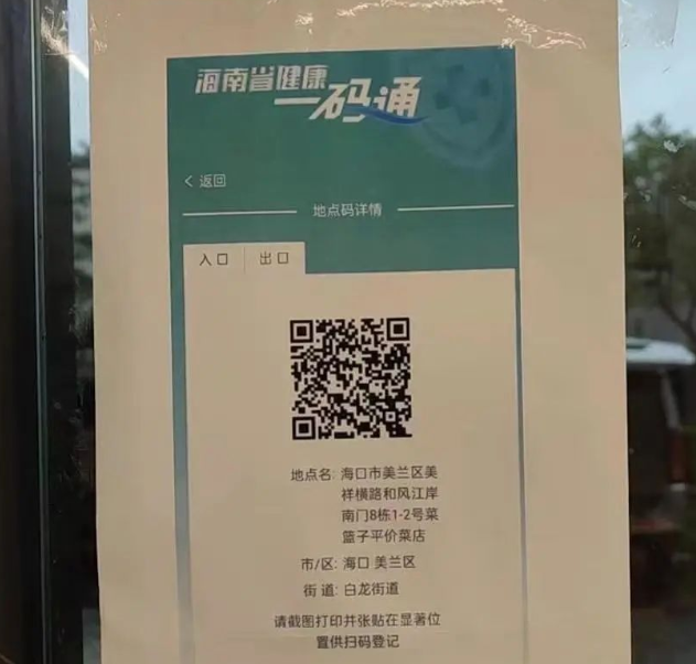 为做好疫情防控下保供稳价工作,在海口市菜篮子各直营门店、社区便民网点均有粘贴“地点码”,店员要求所有顾客进店前出示健康码、行程码,同时扫描“地点码”,认真查验绿码后才准进入各网点选购。